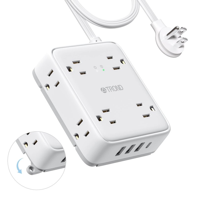 TROND Ultra-Thin Flat Plug Power Strip USB C, Flat Extension Cord Indoor with Surge Protector, 8 AC Outlets, 4 USB Ports, Wall Mount, Dorm Room Essentials, White
