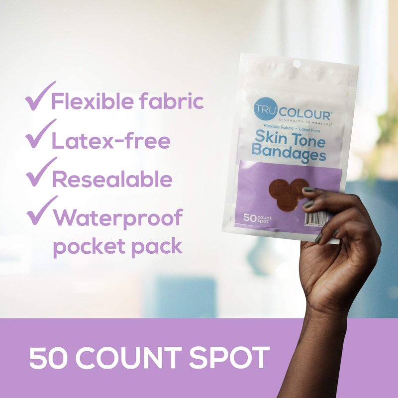 Tru Colour - Spot Bandages, Flexible Fabric Adhesive Bandages, Dark Brown Skin Tone Shade, Purple Bag, 50 Count