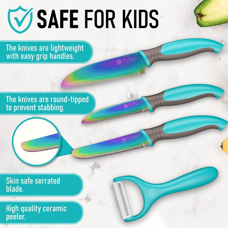 - KIDS KNIFE SET FOR REAL COOKING – 5 Piece Kids Knife Set in Aqua – Childrens cooking knives with Kids Chef Knife, Kids Paring Knife, Kids Tomato Knife, Kids Peeler & Universal Holder – TruChef