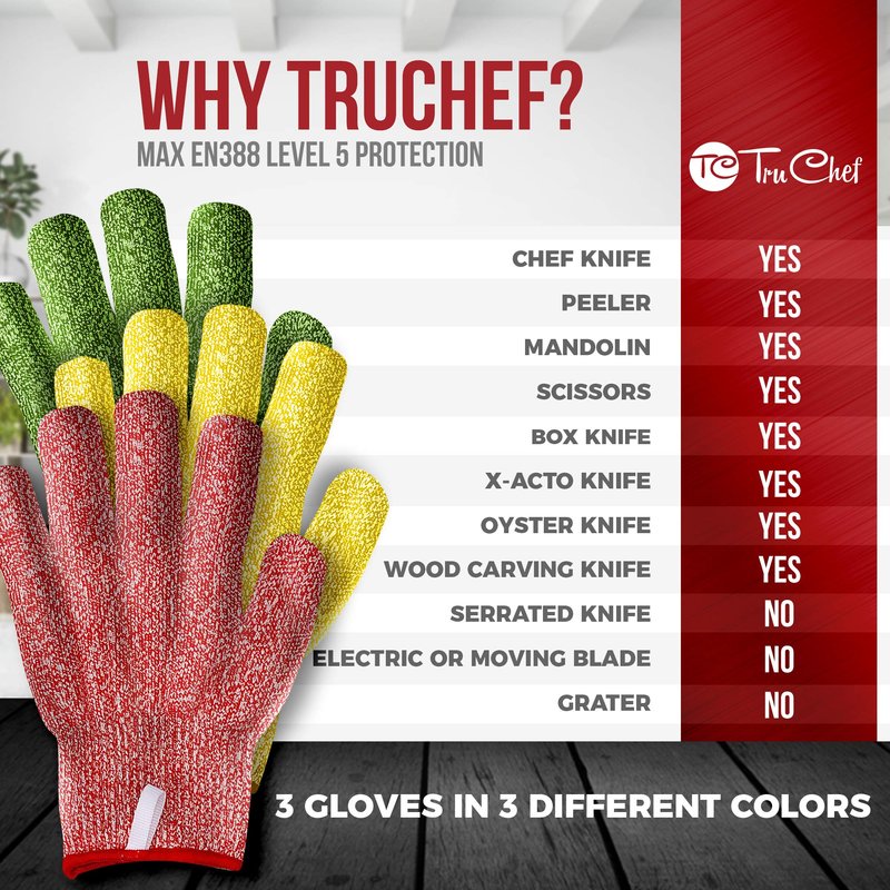 - A GLOVE FOR EVERY USE: Unlike ordinary gloves sold in pairs, the TruChef Cut-Resistant Gloves come in a convenient 3-pack, so you'll always have the right glove for any kitchen or household need.