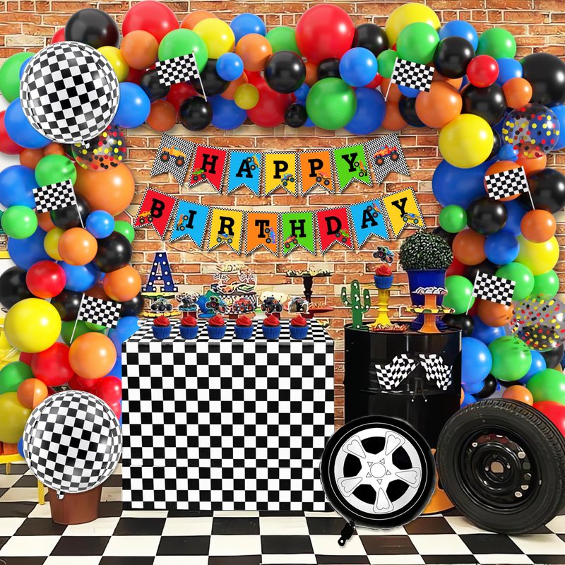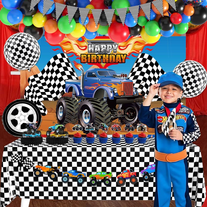 - Valuable Package: 1 truck themed backdrop, 1 tablecloth, 1 truck banner set, 1 triangle bunting banner, 1 HAPPY BIRTHDAY banner, 6 pcs flags, 1 happy birthday cake topper, 12 pcs cupcake toppers, 2 pcs honeycomb table centerpieces, 5 truck element foil balloons, 64 pcs latex balloons and 3 balloon tools. A set includes everything you need.