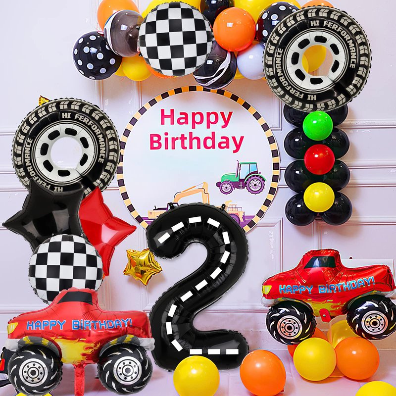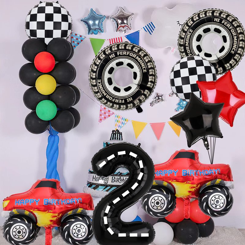 - Package Included: 2PCS Giant Size Truck Foil Balloon, 2 pcs tire wheel balloon,2pcs Round Racing Foil Balloons, 18’’ Red and Black Star Balloons, 1PCS 40’’ 4 Number.Totally 9PCS. Perfect for a Truck Racing Car Theme Party.