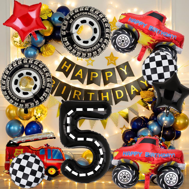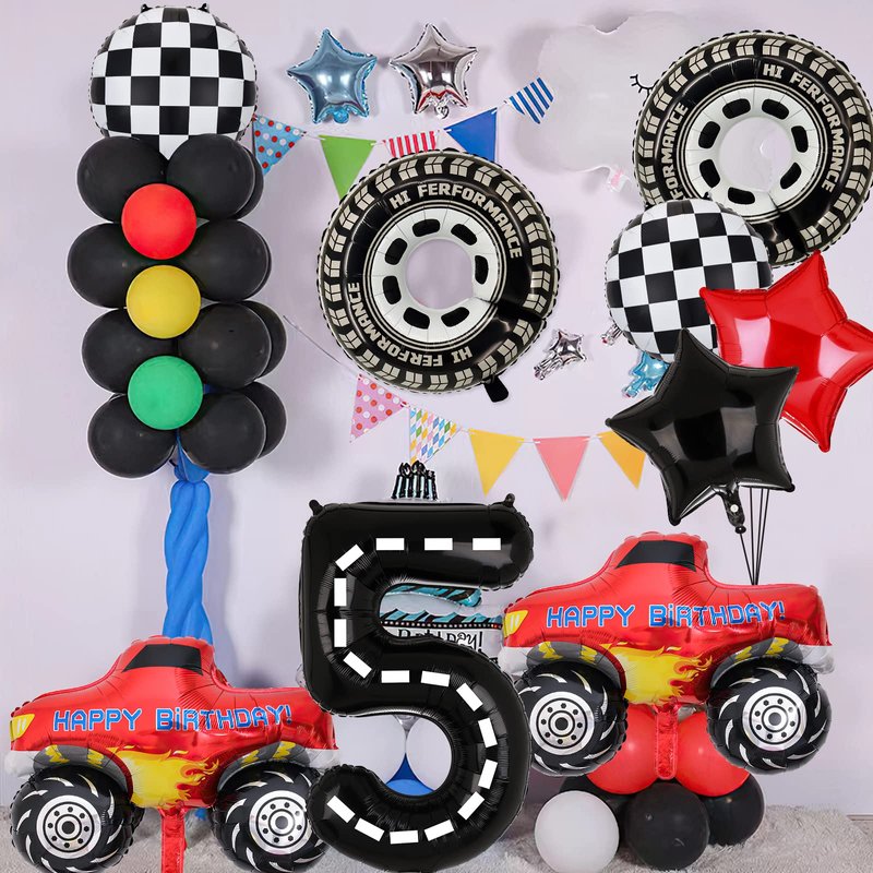 - Package Included: 2PCS Giant Size Truck Foil Balloon, 2 pcs tire wheel balloon,2pcs Round Racing Foil Balloons, 18’’ Red and Black Star Balloons, 1PCS 40’’ 4 Number.Totally 9PCS. Perfect for a Truck Racing Car Theme Party.