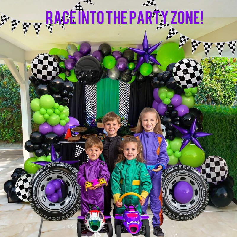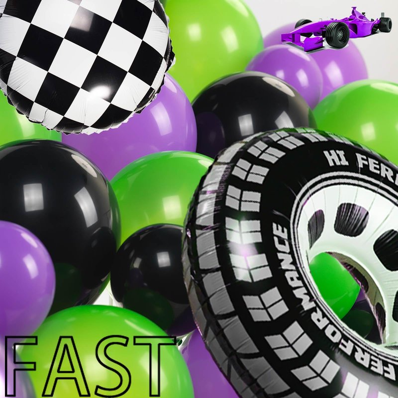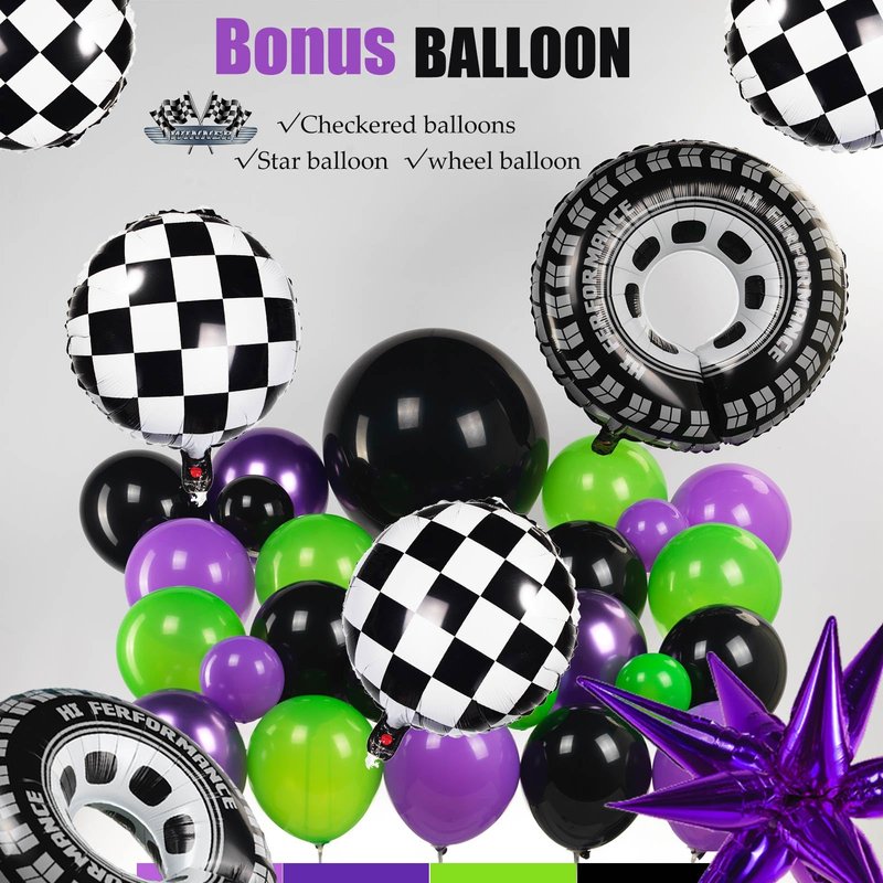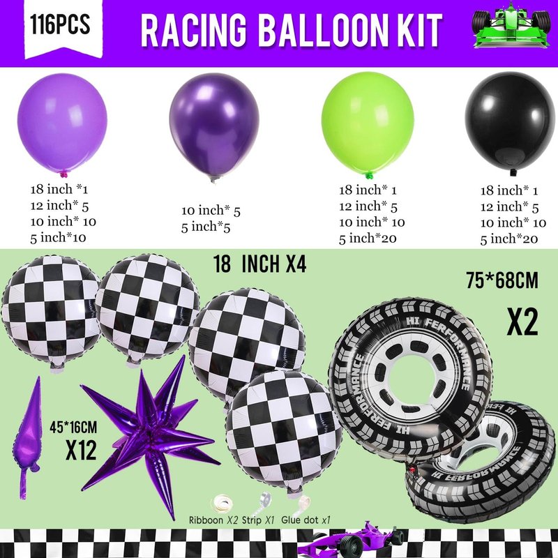 116 PCS 5/10/12/18inch balloons in various sizes, we chose Purple/lime green/black as Palette for the theme, Add Wheels checkered star foil balloons, with Tools Glue Dot Kit lets you create a cheerful and vibrant racing car themed party.