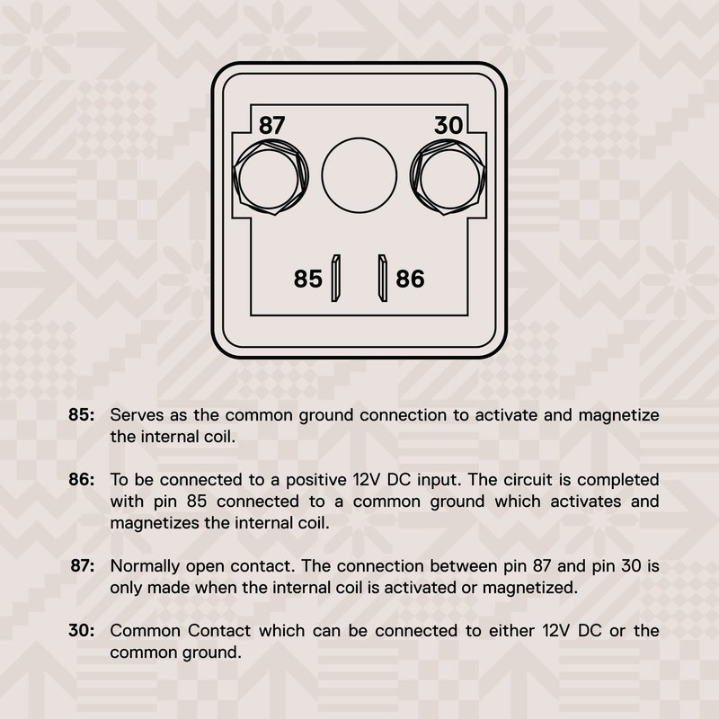 - Heavy Duty 12VDC (14V Max) Continuous Duty Rated 4-Pin SPST (Single Pole Single Throw) Relay.