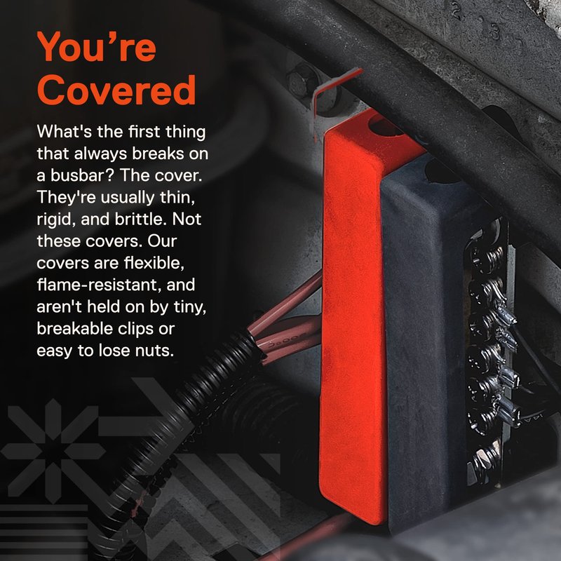 - YOU'RE COVERED - What's the first thing that always breaks on a busbar? The cover. They're usually thin, rigid, and brittle. Not these covers. Our covers are flexible, flame-resistant, and aren't held on by tiny, breakable clips or easy to lose nuts.