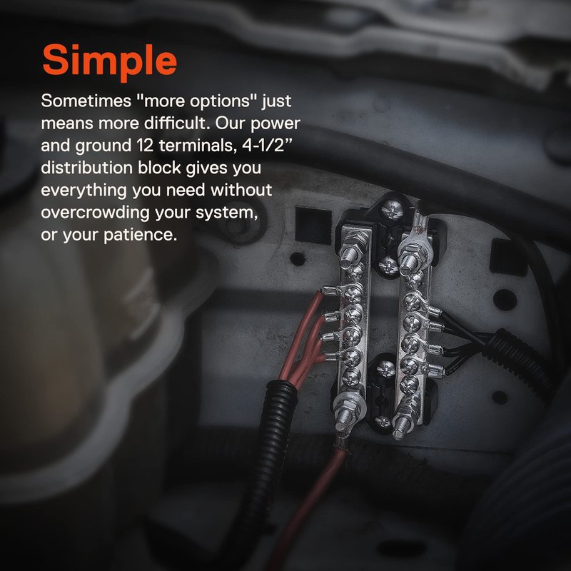 - SIMPLE - Sometimes "more options" just means more difficult. Our power and ground 12 terminals, 4-1/2? distribution block gives you everything you need without overcrowding your system, or your patience.