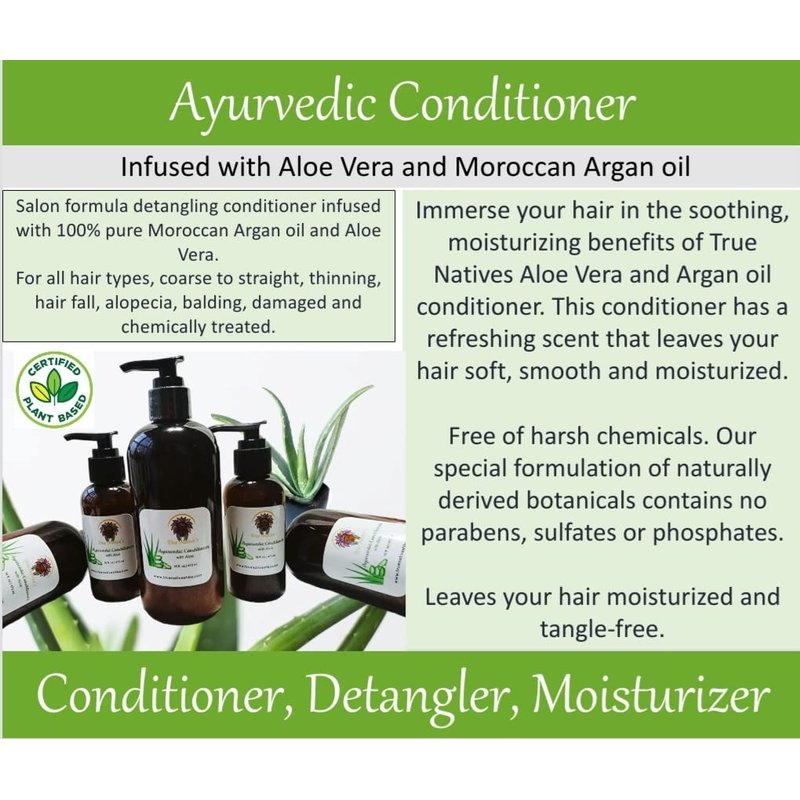 Salon formula detangling conditioner infused with 100% pure Moroccan argan oil. Leaves your hair moisturized and tangle-free. Suitable for ALL hair types from coarse to straight. Immerse your hair in the soothing, moisturizing benefits of True Natives Aloe Vera and Argan oil conditioner. This conditioner has a refreshing scent that leaves your hair soft, smooth and moisturized. Free of harsh chemicals. Our special formulation of naturally derived botanicals contains no parabens, sulfates or phosphates. Benefits Works great with True Native’s hair growth Ayurvedic Shampoo, Elixir and moisturizer.