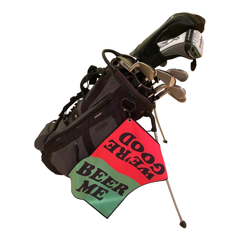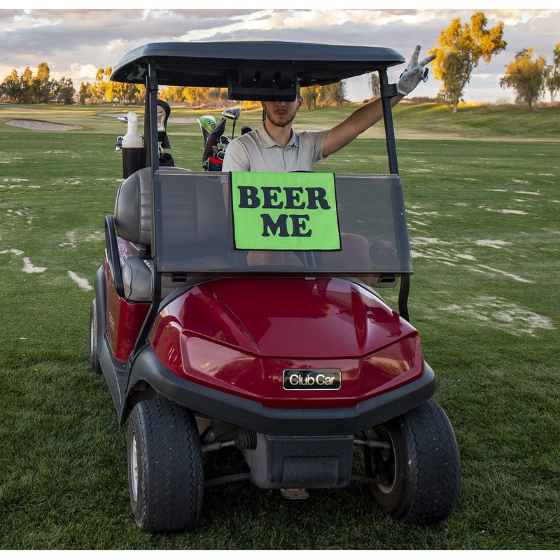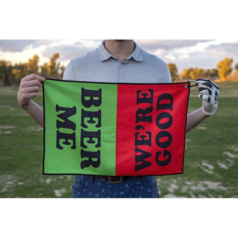 DUAL PURPOSE Waffle style microfiber golf towel will keep your clubs clean and help make sure your cupholder is never empty! NEVER MISS A ROUND The best way to let the cart girl know if you need beer. Green side with "Beer Me" lets her know you need another round and Red side with "We're Good" lets her pass without bothering you. The perfect way to flag down your next drink! QUICK CALL TO THE DRINK CART Simply drape your towel over the windshield to alert the cart girl if you need a beer or to tell them you're good until the next lap around the course LARGE SIZE 16" x 24" and comes with a carabiner to quickly and easily attach to your golf bag for club cleaning GREAT GIFT Perfect for any golfer and an awesome gift for bachelor parties, Father's Day, Birthdays and Christmas