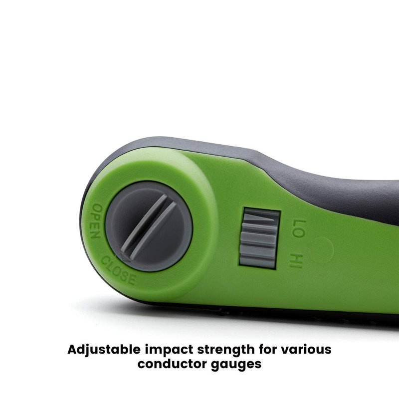 There are two settings for this tool: High and Low. This setting is used to adjust the amount of force required before the kinetic energy mechanism is engaged and makes the “bang” noise. Use the High setting for 23 AWG or thicker conductors. Use Low for 24 AWG or thinner conductors.