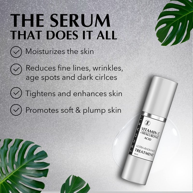 Improved skin textureRich in Natural IngredientsOur potent formulation is supercharged with skin-enhancing benefits made possible through the combined properties of carefully selected ingredients such as hyaluronic acid, vitamin C, vitamin E, radish root extract and aloe vera.Recommended UseAfter cleansing and toning, apply a small amount to your skin. Pat down and let your skin absorb it. Natural Skin Care Products for YouWe’re committed to providing only the highest quality ingredients for the skin you’ve always dreamed of. Our face serums are crafted with only skin-safe materials and are made to help you fall in love with your skin.Give yourself the gift of radiant, rejuvenated skin with Trugari's Vitamin C + Hyaluronic Acid Ultra-Radiance Treatment now!