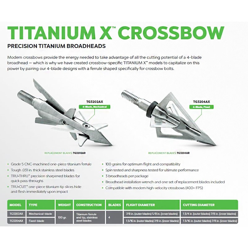 - CONSTRUCTION - The crossbow-specific Titanium X broadheads feature a Grade 5 CNC-machined one-piece titanium ferrule; Featuring a TRU CUT one-piece titanium tip, these broadheads slice through hide and flesh immediately upon impact