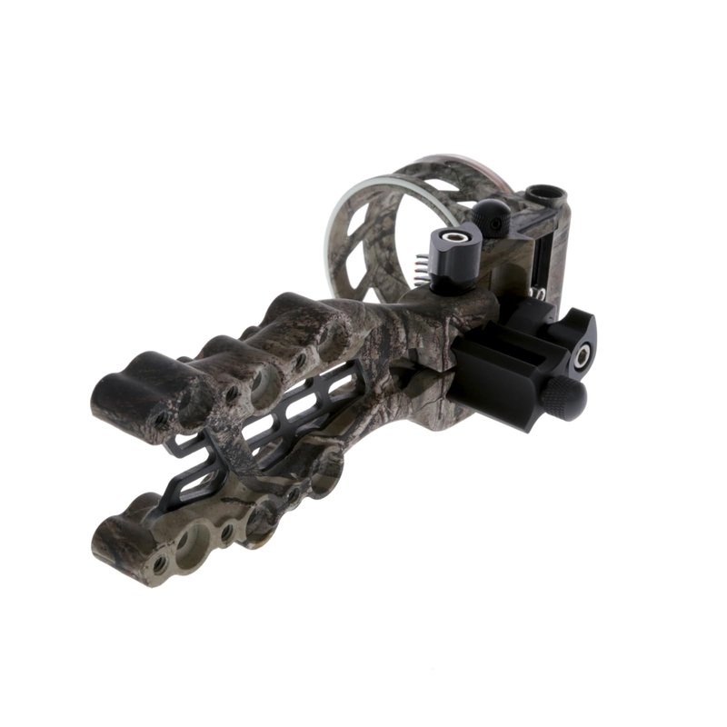- SPECIFICATIONS - Aperture diameter: 1.9 in; Level: Adjustable 2nd and 3rd axis; Pins: 5 (5x.019 in. dia.); Windage Elevation: Tooless Micro-adjustable; Finish: Real-Tree Xtra Camo; LED light included.