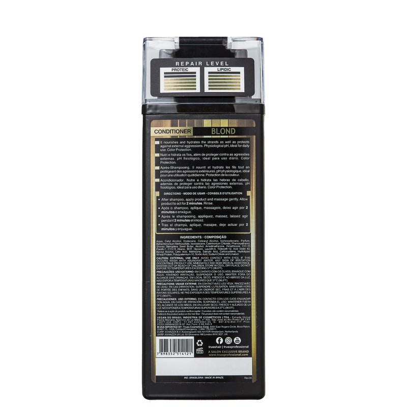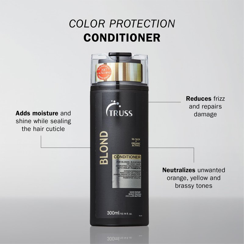 TRUSS’s Professional Blond Conditioner has an intensive violet purple toning formula refreshes your blonde colors and keep them cool by removing yellow, orange or brassy tones that make your color appear warm. Extend the life of your expensive salon hair coloring services and reduce your visits to the salon. Straight, curly or heavily damaged hair can benefit from the natural oils and repair ingredients only found in TRUSS Professional hair products. Seal and protect your hair from frizz by sealing the cuticle, locking color and moisture deep within, and preventing humidity from ruining your finished hairstyles. TRUSS Professional Blond Conditioner is the ideal conditioner for types of blonde hair color. Use daily after shampooing and comb through for maximum detangling and blonde toning. Keep your hair looking healthy and supple while repairing chemical damage from high intensity color services like highlights, double process blondes and bleach services. Truss has a 15-year history of producing high-quality products that have an impressive presence in more than 9 countries within the finest hair salons in the world. The professional and home care brand offers a wide variety of hair masks, ultra-hydrating conditioners and formulas that are free from any kind of additives, preservatives or chemicals to make sure you receive only the finest source of ingredients.