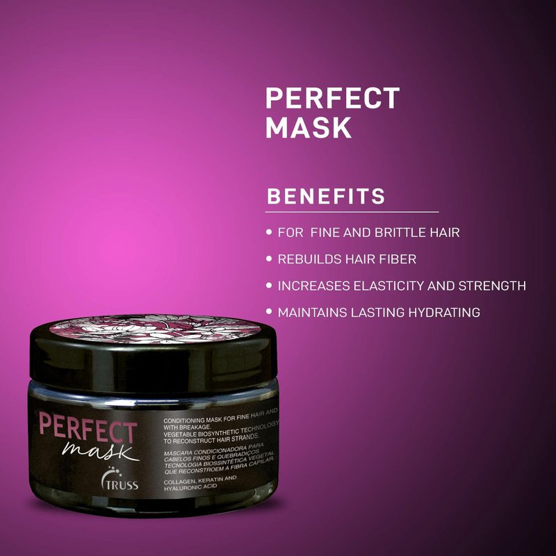 Truss Professional Perfect Hair Mask is a deep conditioning, intensive moisture hair mask treatment for fine, brittle, dry, dull hair in need of hydration, softness and shine. This keratin hair mask is infused with hyaluronic acid and collagen for elasticity and shine. Block humidity, reduce static and frizz with this keratin hair mask that works without excessive weight. Use this product 1-3 times a week on fine, thinning hair, or as needed to maximize hair health and shine.
