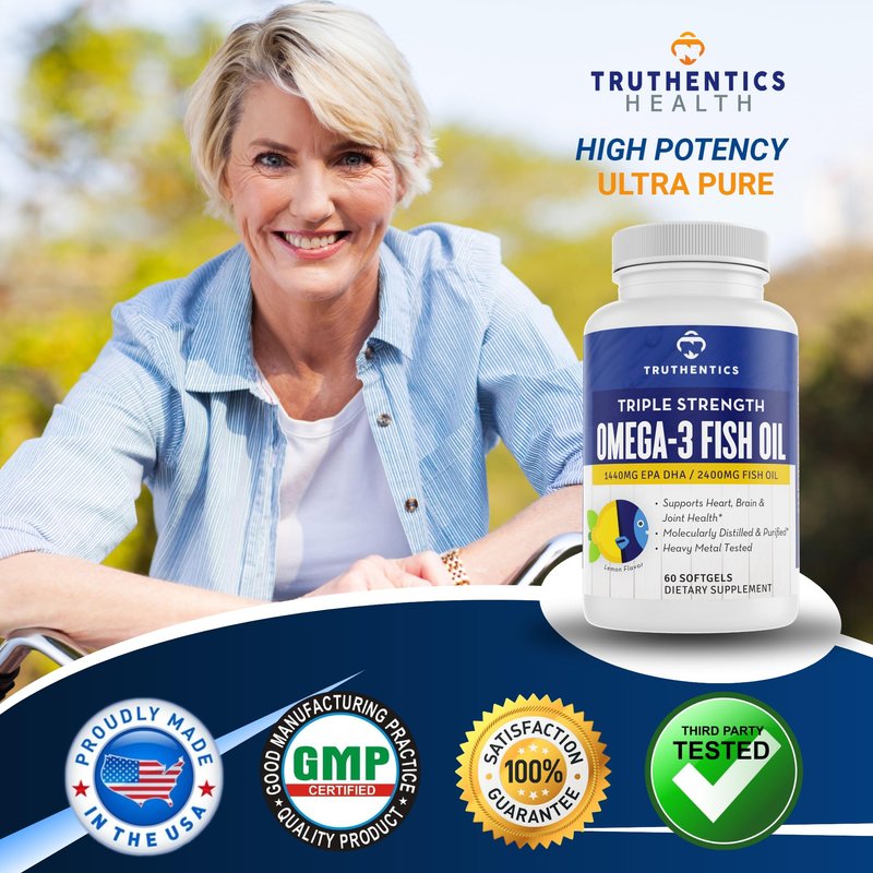 TRUTHENTICS Omega 3 Fish Oil, 2400 mg Per Serving, Triple Strength - High EPA + DHA Omega-3 Fatty Acids - Burpless Lemon Flavor Fish Oil Supplement for Men & Women - 60 Softgels