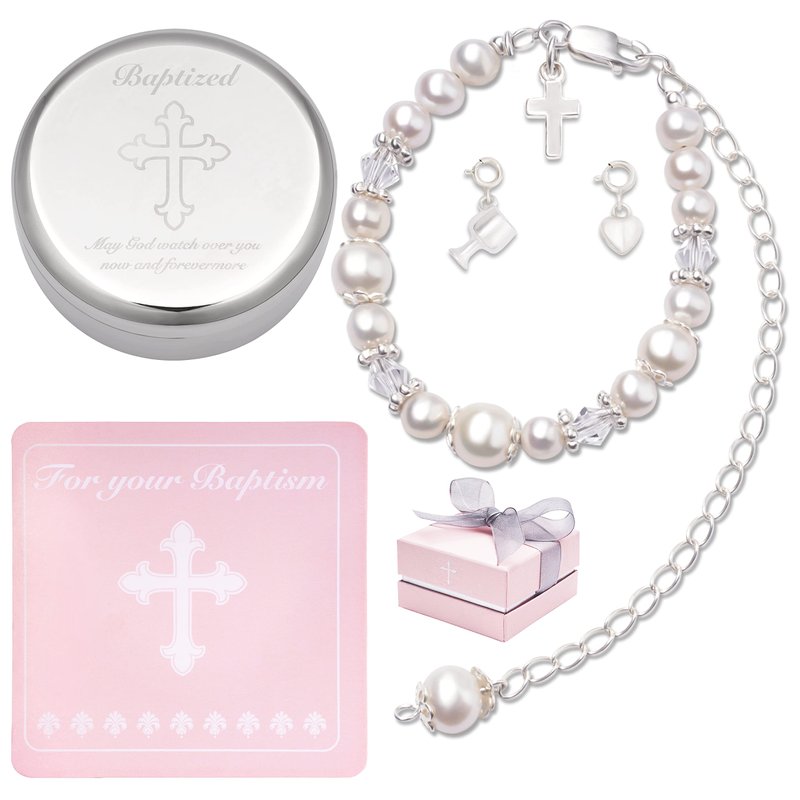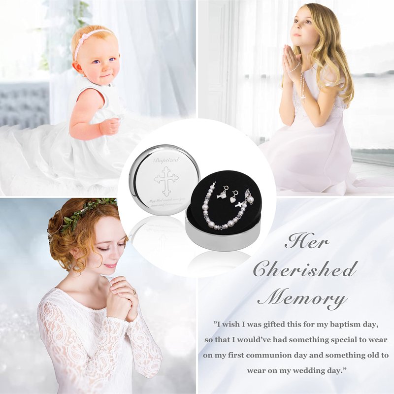 Tryuunion Baptism Bracelet in Sterling Silver and Cultured Pearls for Baby Girls, Comes with a Unique Silver-plated Jewelry Keepsake Box, Christening and Baptism Gifts For Girl,Includes 3 Charms