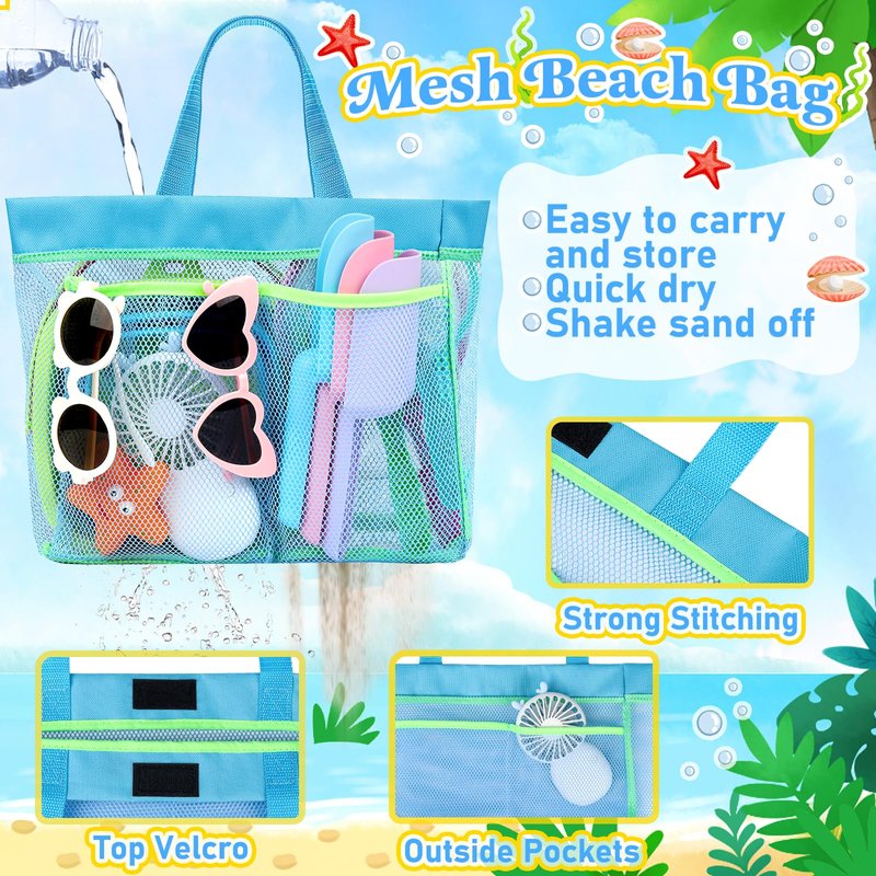 - Upgraded Mesh Beach Bag -- The beach bag is made with premium mesh fabric and strong stitching, not easy to tear off. It can filter sand and water, also dry quickly. There are two pockets on the bag, and a lot of space inside the bag. So you put other beach essentials and travel beach toys in it. Very convenient for storage and travel