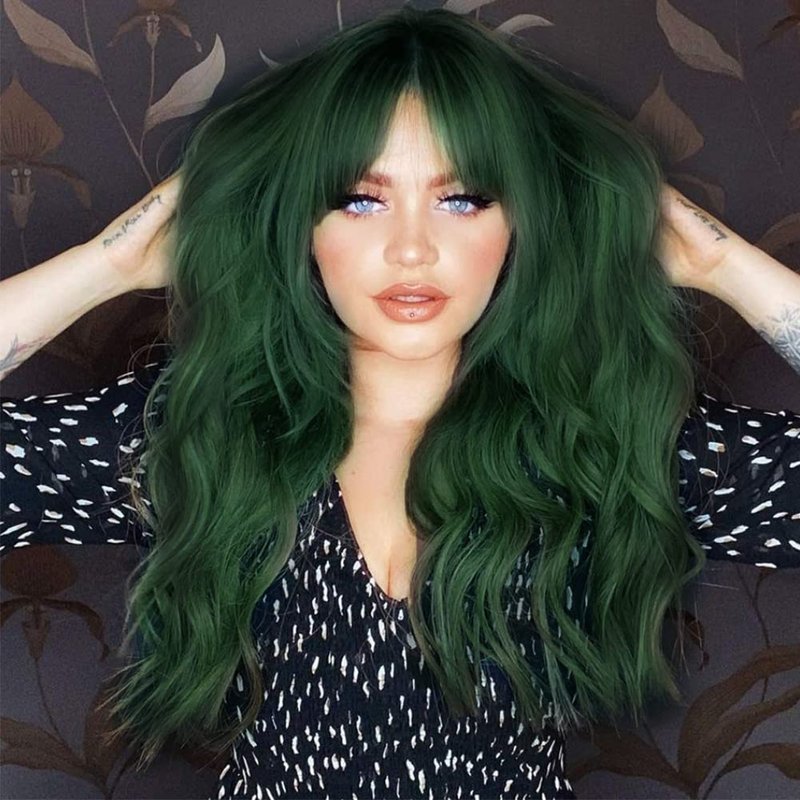 Tseses Green Long Curly Wigs with Bangs for Women Natural Synthetic Heat Resistant Women Daily Halloween Costume Wig
