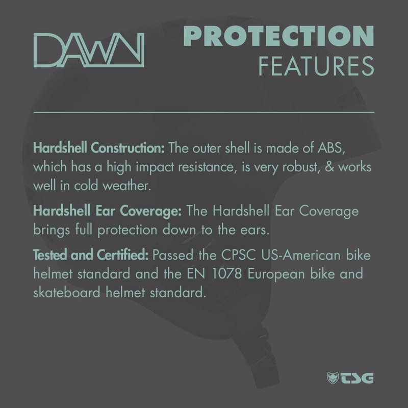 - LOW FIT & EXTENDED EAR PROTECTION: Dawn helmets offer a low-profile fit for better comfort and coverage than conventional helmets. The smart low fit design covers the entire back and sides of the heat, without any restriction on vision and mobility. TSG Dawn extends the hardshell protection down to the ears, with its retro style, classic ear protection profile from the 80s. The full-cut design stands up to the rigors of high-speed falls or high-impact slams, without getting squished.