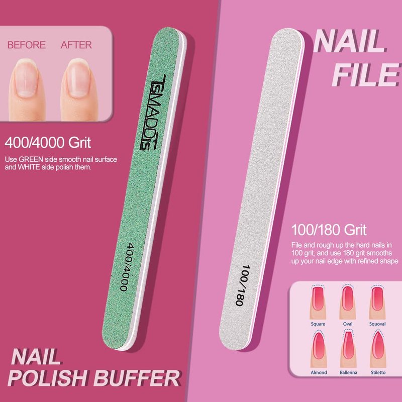 - Nail Files & Nail Polishing Buffers: Double sided files 100/180 can file and rough up the hard fingernails and toe nails in 100 grit, and use 180 grit smooths up your nail edge with refined shape. Nail Polishing Buffer:400 grit green side can refine nail surface and 4000 grit white side helps to smooth nail surface. The buffer block and files are suitable for polishing uneven nail surface to make your nails smooth.