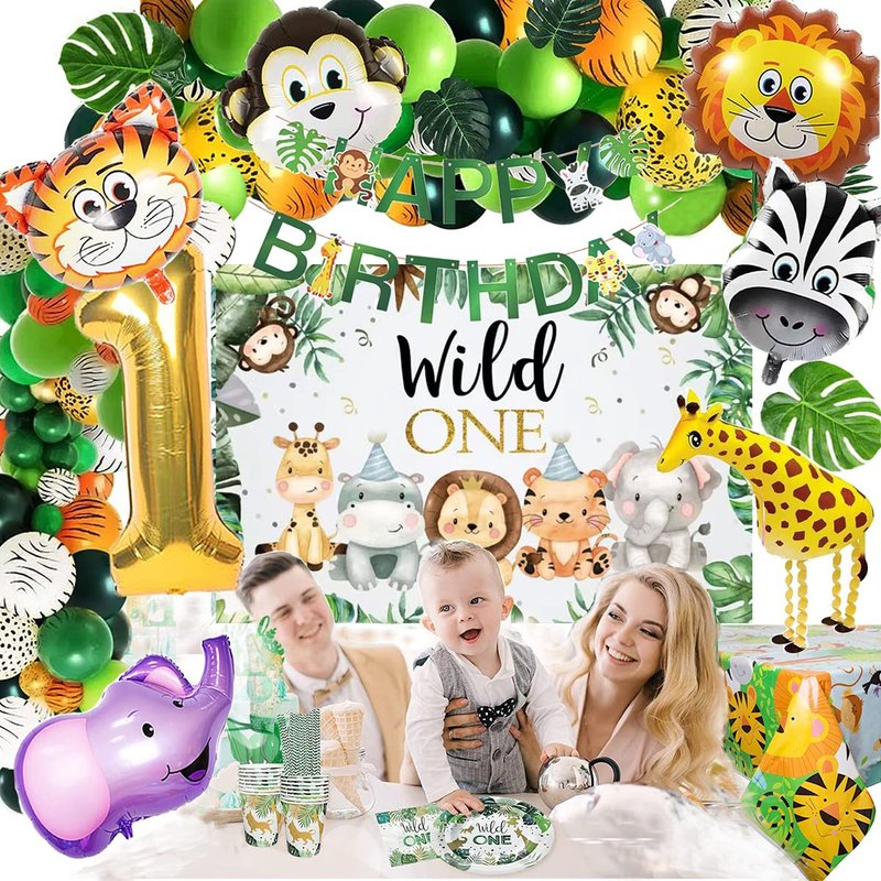 - SAFARI THEME 1ST BIRTHDAY PARTY DECORATIONS: Our jungle birthday party supplies Including 89pcs safari balloons(Safari balloon garland kit ), 6pcs safari animal foil balloons, 1pcs number 1 foil balloon, 6pcs leaves, 1pcs HAPPY BIRTHDAY banner, 1pcs bees one high chair banner, 6pcs safari cake toppers, 1pcs first birthday crown, 1pcs safari animal tablecloth, 1pcs backdrop banner.
