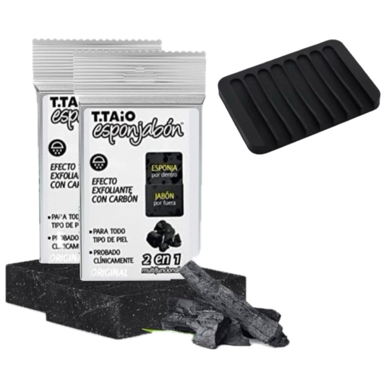 T.Taio Esponjabon Charcoal Soap Sponge 2-Pack Bundled with Soap Tray (2-Pack Plus Soap Tray)
