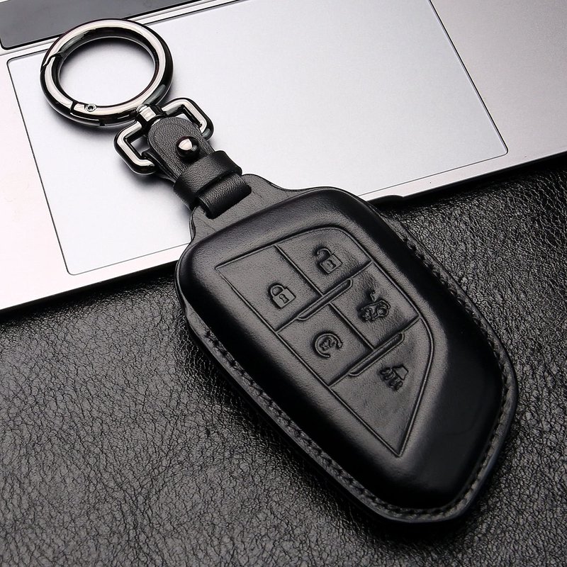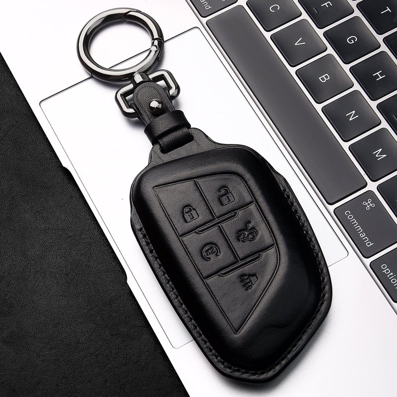 Tukellen for Cadillac Leather Key Fob Cover with Keychain Leather Key Case Key Shell 360 Degree Full Protection Compatible with 2020 2021 Cadillac ct5 CT4-V Corvette C8 5-Buttons-Black