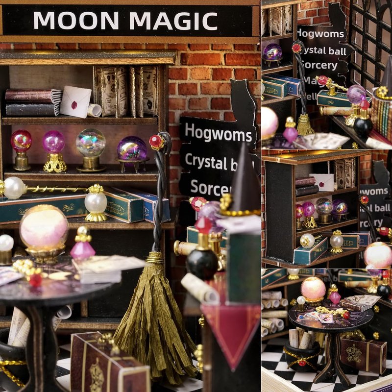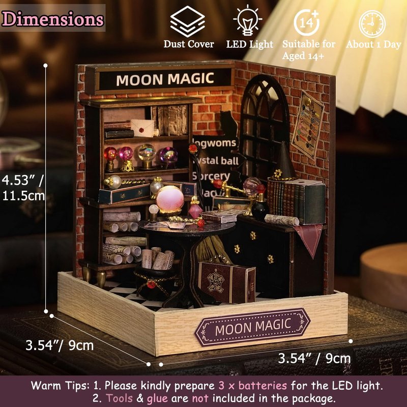 - Excellent Quality & Exquisite Designed - Materials are of excellent quality, miniature furniture and other wooden pieces are precisely cut so that they fit together perfectly. Magical wand, Magic potion, magical books, wizard hat, suitcase and other ornaments, these miniature dollhouse accessories are realistic, exquisitely and simply designed, looks like a tiny magical room. Dust cover can protect the dollhouse from getting dirty