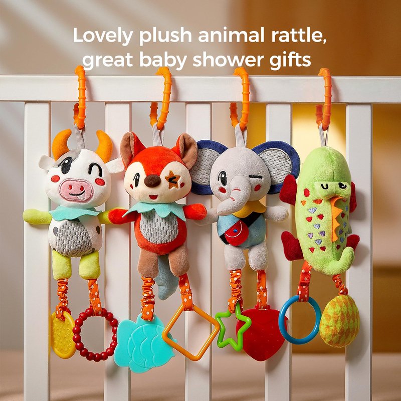 - 【Crib Hanging Animals Toys】These soft sensory infant toys designed with 4 cute Animals(Fox,Elephant,Cow,Crocodile),and designed with a hanging ring for easily hanging in the stroller,cot,crib,pram and car seat,baby playmat,baby gym,outdoor or indoor.