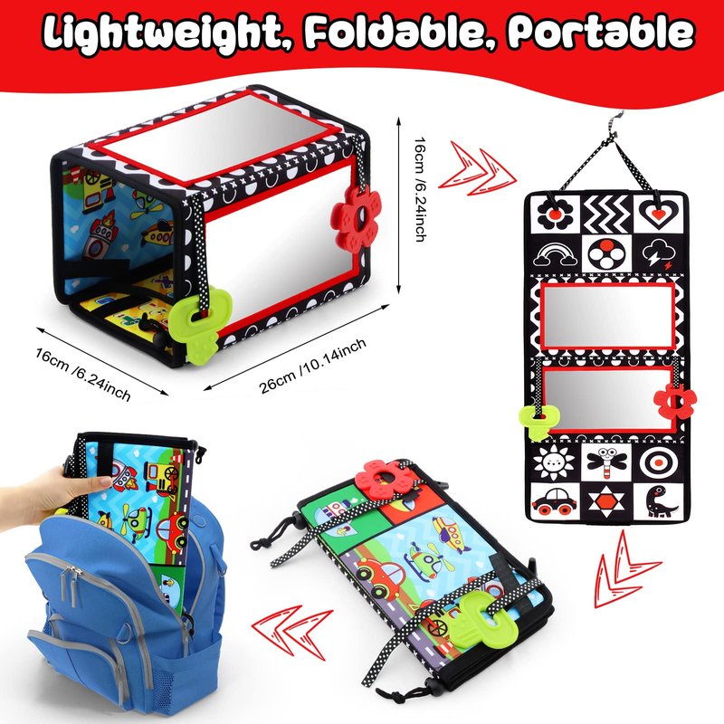 Tummy Time Floor Mirror with Crinkle Cloth Book and Teethers, Double-sided Baby Mirror High Contrast Black and White Baby Toys, Folding Crawling Activity Mat Floor Mirror for Infants 3 6 12 Months