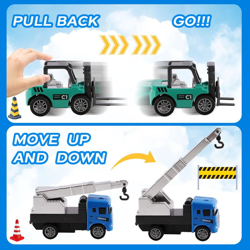 - Novelty Pull Back Cars : Introduce your child to the amazing world of construction toddler cars toys from an early age, this novelty toddler truck cars that is perfect! Each toddler mini construction toys has its own unique functions and features, forklift toy, toy crane and digger toys for boys, let your kids to learn through play, construction vehicles for kids 3-5. the different toy trucks shapes can stimulate your child's imagination and creativity