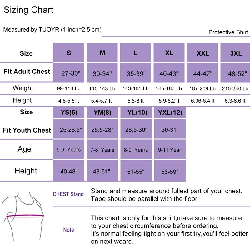 - Shirt Fit Chest Size: S=27-30". M=30-34". L=35-39". XL=40-43". XXL=44-47". 3X-Large=48-52". We're kindly inform you to make sure to measure your chest circumference before ordering. It's normal feeling tight on your first try, you'll feel better on next wears.