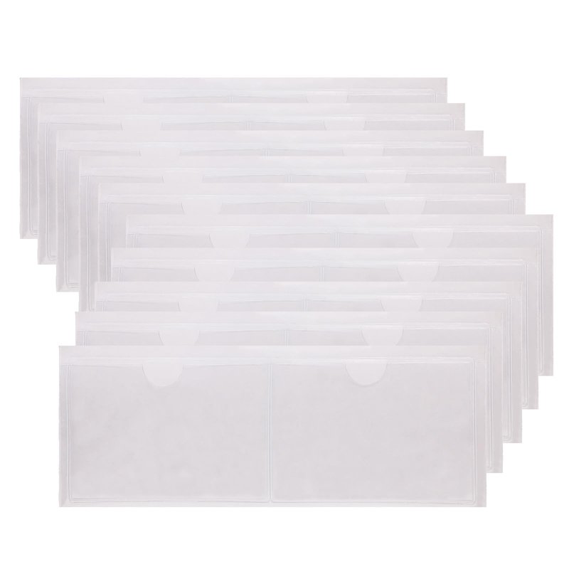 - These sticky index card pockets are made of quality plastic materials with top side open for loading,clear and durable vinyl keeps your card crisp and pristine,not easy to tear, and strong bearing capacity,easy to relabel the tote by just slipping a different card in.