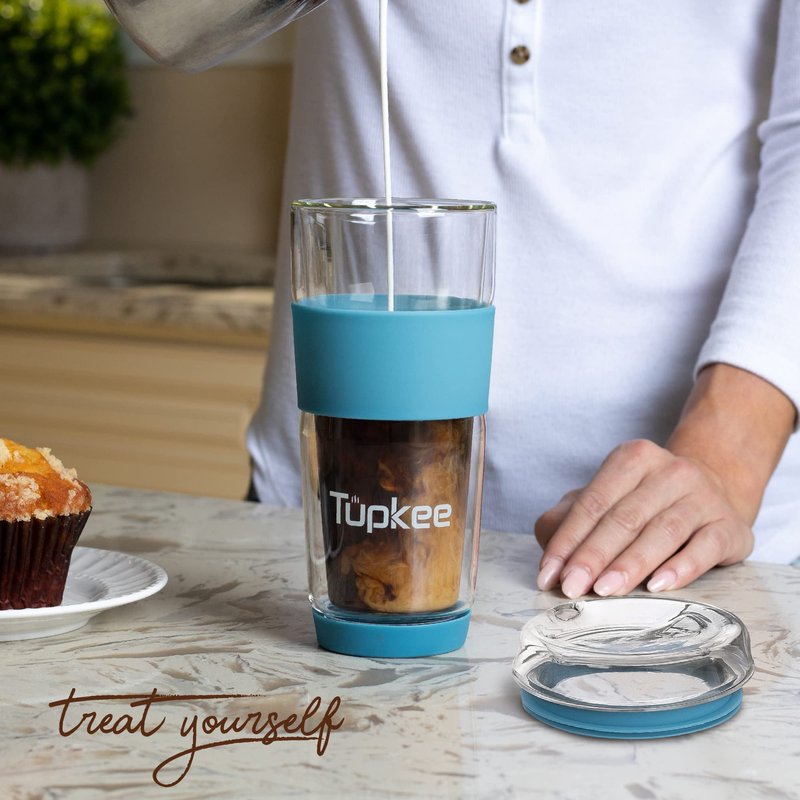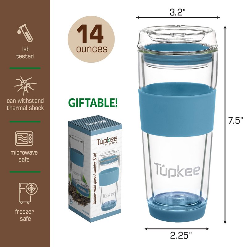Tupkee Double Wall Glass Tumbler - 14-Ounce, All Glass Reusable Insulated Tea/Coffee Mug & Lid, Hand Blown Glass Travel Mug - Niagara