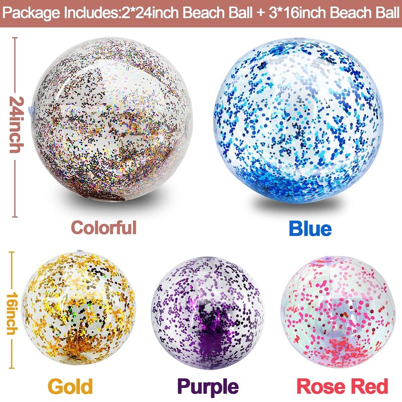 - 5 Pieces Glitters Confettis Beach Ball: You can get 2 pack 24 Inch sequins jumbo beach balls and 3 pack 16 inch sequin beach balls. Assorted sizes inflatable glitters beach balls can satisfy your needs of playing with your kids or friends.(Note: Adult supervision all the times when children are using in the water, pool or beach. Babies usually does something unexpected, so don't let your baby play alone.