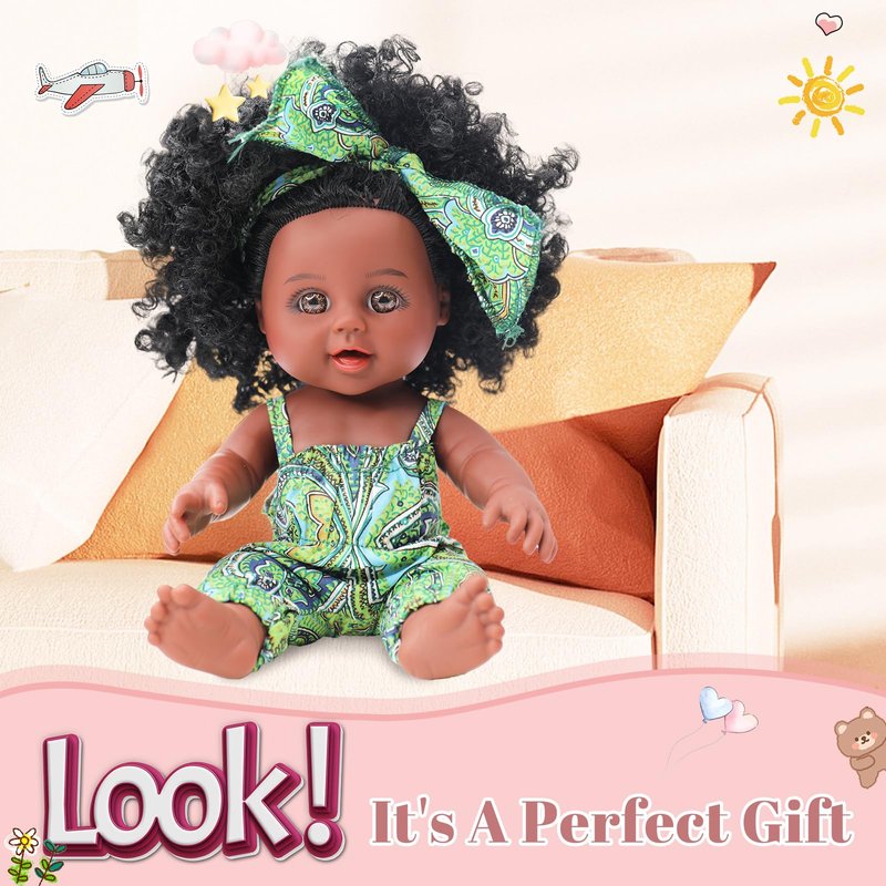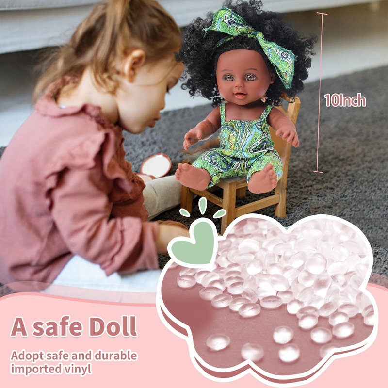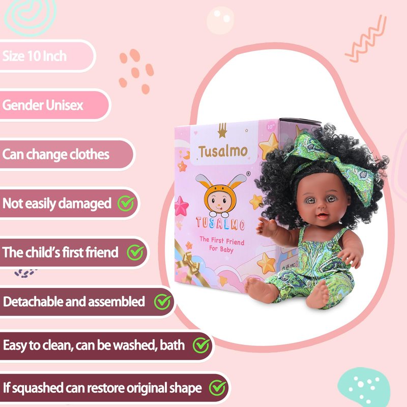 - 【Harmless Material】TUSALMO Black Dolls are made from vinyl PVC material, which is harmless to children and environmentally friendly. Each doll undergoes rigorous testing to meet US toy safety standards. While it's not as soft as a cotton doll, the material still provides a pleasant and durable texture, ensuring it can withstand countless playtimes. Ideal for parents looking for safe and reliable dolls for 3+ year old girls.