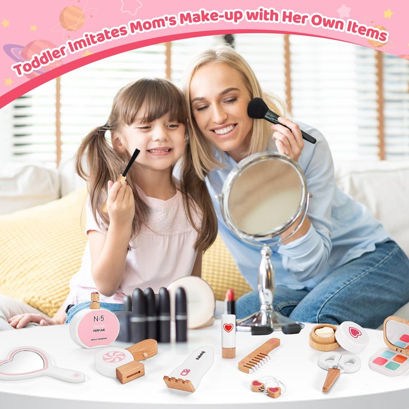 TUSEASY 16-Piece Wooden Makeup Toy Set, Pretend Play Makeup Kit for Toddlers & Little Girls Aged 3-8, Fake Makeup and Beauty Salon Toys, Christmas & Birthday Gifts for Toddler Kids