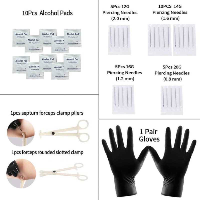 - High-quality materials: All piercing jewelry included in this set is made of 316L stainless steel, which is known for its durability, corrosion resistance, and hypoallergenic properties. You can trust that these accessories are safe, reliable, and long-lasting. Plus, the set also includes a pair of black nitrile gloves and 10 alcohol pads for hygienic and sanitary piercing.