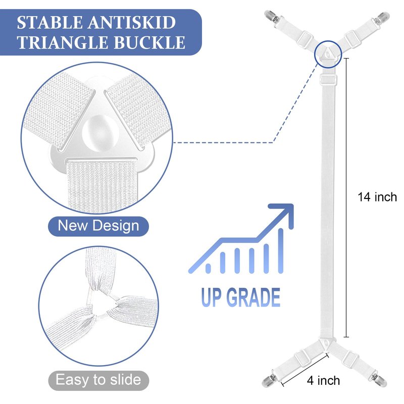- ✅【Upgrade Sheet Suspenders】The newly designed non slip triangle buckle makes the sheet straps no longer slide, providing a more stable effect of fixing the bed sheet. Multi-functional Adjustable length from 96cm/38inch –171cm/67.3inch, Nickel Plated Clamps with Fabric Protector.