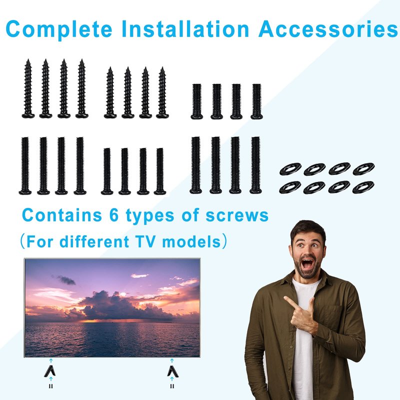 Compatible with TCL Smart TV Models:28 Inch -28S305 28S405; 32 Inch -32S355 32S331 32S335 32S325 32S301 32S303 32S305 32S327 32S359 32S330 32S334 32S405 32S401 32S359 32S356 32S321; 40 Inch -40S355 40S325 40S303 40S305 40S330 40S334 40S405 40S321; 43 Inch - 43S453 43S455 43S421 43S423 43S425 43S431 43S435 43S433 43S325 43S303 43S305 43S525 43S517 43S405 43S515 43S403 43S434 43S446; 49 Inch - 49S423 49S303 49S517 49S515 49S403 49S405 49S321; 50 Inch - 50S453 50S455 50S423 50S431 50S435 50S433 50S525 50S555 50S515 50S434 50S446 50S546; 55 Inch - 55S453 55S455 55S421 55S423 55S431 55S435 55S433 55S525 55S555 55S517 55S401 55S403 55S434 55S446 55S546; 65 Inch - 65S453 65S455 65S421 65S431 65S435 65S433 65S525 65S555 65S515 65S401 65S403 65S434 65S446 65S546Package Included: 1 x Left Stand Base 1 x Right Stand Base 1 x Installation Screws 1 x Installation Instructions