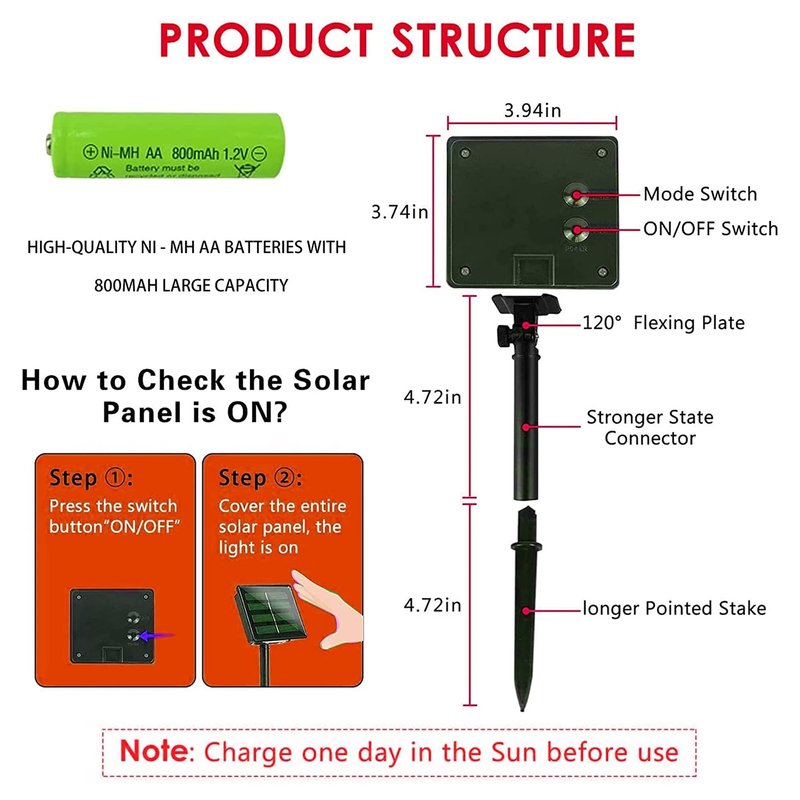 - Solar Power Supply: Solar powered, no need to replace batteries, auto on at night, and auto off at daytime, saving energy and protecting the environment. Let life becomes more efficient and more convenient. Each solar panel is equipped with Ni-MH AA 800m AH battery, it can work for 10 to 14 hours when fully charged.