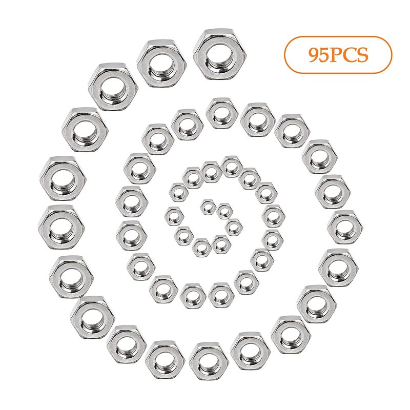 - 【PACKAGE】:A box of 95 pieces in total,all of hex nuts hardware set are packed in clear storage boxes with size labels of the whole package.in order to avoid the nuts being scattered or lost during and mixing.
