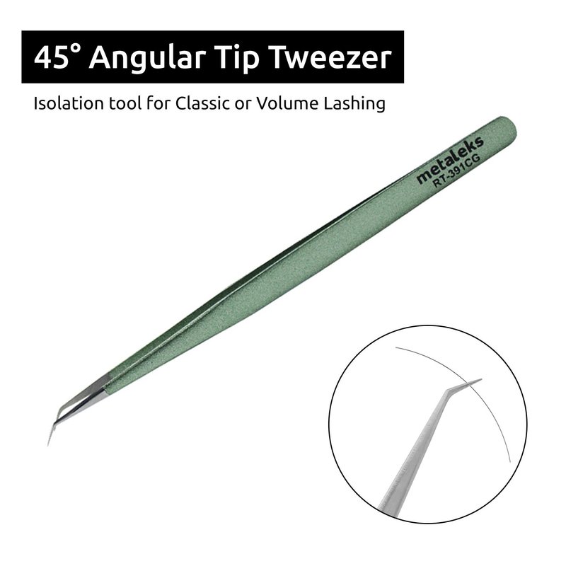 Tweezers for Eyelash Extension - Long 45° Angular Tip Tweezers - Hand Crafted Surgical Stainless Steel Precision Tweezers (Metallic light Green Powder Coated)