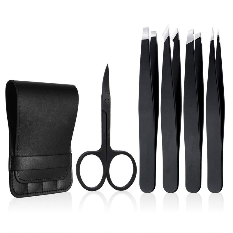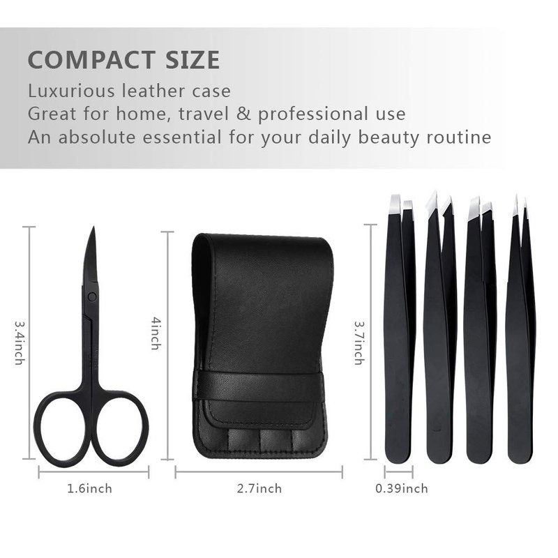 Tweezers Set 5-Piece - Professional Stainless Steel Tweezers with Curved Scissors, Best Precision Tweezer for Eyebrows, Splinter & Ingrown Hair Removal with Leather Travel Case (Black)