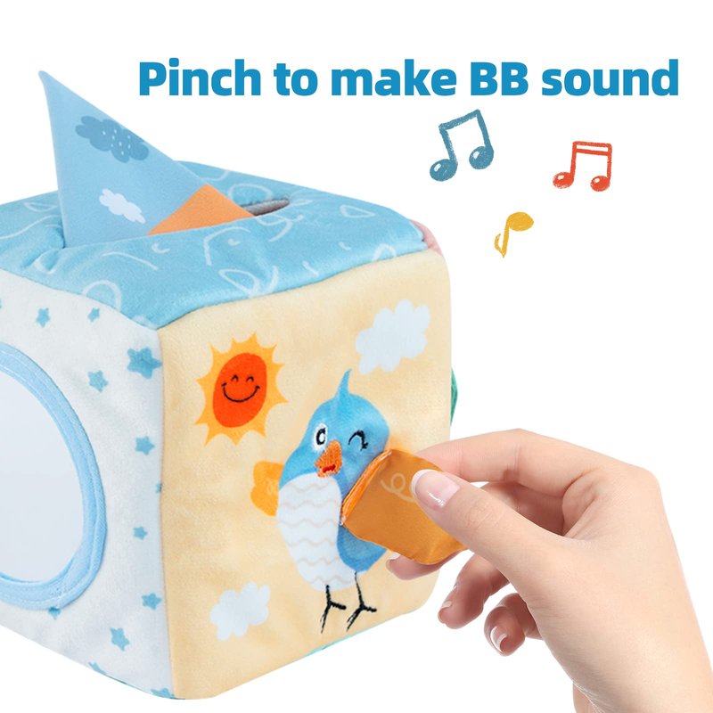 - 【The Perfect Developmental Tissue Box Toy】This sensory pulling toys idea is inspired by babies’ fascination with pulling tissues out and putting them back in. This baby sensory toy was designed by experts in the US. We improved the original idea by adding more fun components such as a mirror, a leaf to crinkle, a peek-a-boo game, a BB sound wing and a sensory fox's tail. This tissue box toy is a perfect sensory toy for babies. It helps develop motor and cognitive skills.