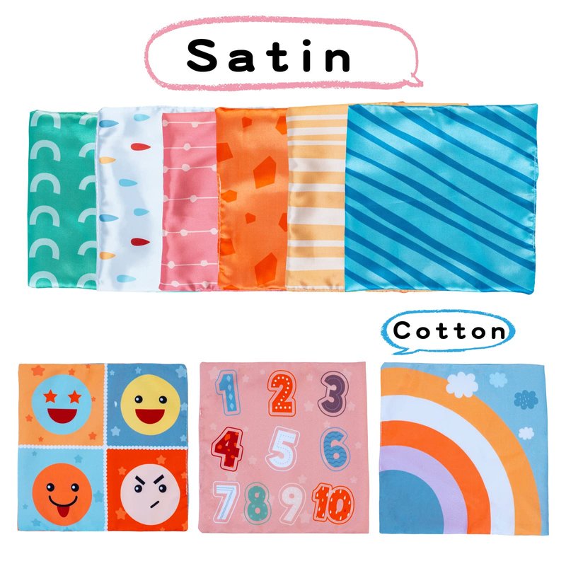 - 【Ultra-soft Material for Babies】The tissue box is made of cotton which is skin-friendly and odorless. Our infant baby tissue box contains 3 multi-themed cotton tissues & 6 colorful high-quality satin fabrics which are very soft to touch for one-year-old boys and girls. Moms don't have to worry about your little lovers putting a toy in their mouth or getting hurt. The tissue box can maintain its shape well and will not collapse. Easy to wash and carry.