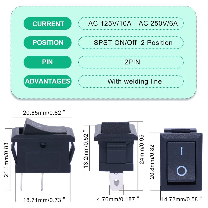 - Rated Voltage and Current : AC 125V, 10A; AC 250V, 6A; Overall Size : 21 x 15 x 24mm/0.8" x 0.6" x 0.94"(L*W*H); Mount Hole Size : 12.5 x 19mm / 0.49"x 0.75"(L * W);