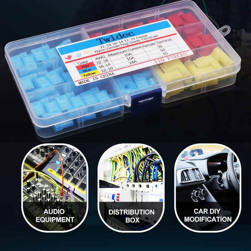 Twidec/110Pcs Nylon Flag Spade Female Insulated Terminals 22-18 18-14 12-10 Gauge Quick Disconnects Electrical Crimp Terminals Connector Assortment Kit for Electrical Wiring Car Audio Speaker N-006