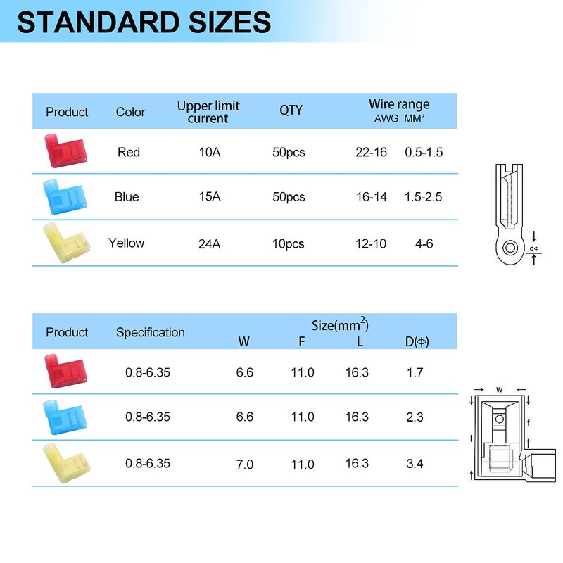 - Wire Range: 22-18 AWG(Red),Maximum current: 10A; 16-14 AWG(Blue),Maximum current: 15A;12-10 AWG(Yellow),Maximum current: 24A;Insert specifications: 0.8 x 6.35 mm